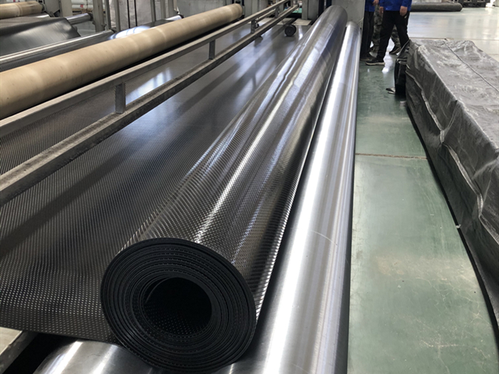HDPE雙柱點糙面土工膜,該生產工藝所生產的產品在保留原樹脂本身具有的優異的力學性能和良好的延伸率及化學性能穩定的基礎上,通過添加一定比例的功能助劑經熔融、擠出、壓延、牽伸等工藝加工的合理控制更增強了產品的抗拉、耐磨、耐穿刺性能,功能助劑的配比添加融合,使產品抵抗酸堿,微生物及化學物的侵蝕功能進一步提高該產品的力學性能比同類普通工藝生產的糙面防滑土工膜高近3倍。膜面柱點由特制模型壓輥壓延而成,柱點分布均勻,美觀,提高摩擦系數,且膜面正反兩面可由不同材質,不同顏色熱融成一體,在工程應用中可根據地質條件、工程要求設置產品正反面。