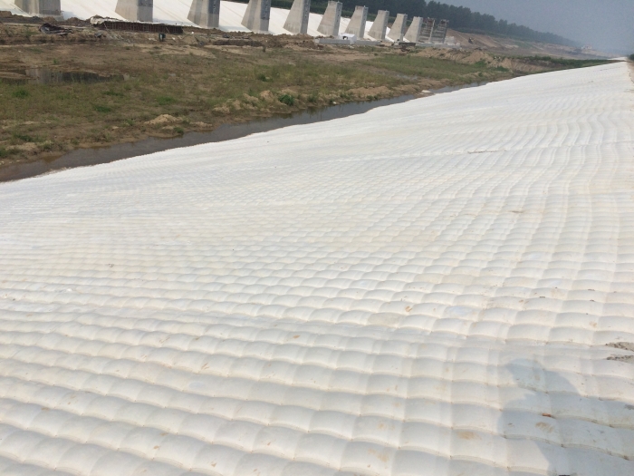 透水性:土工模袋具有一定的透水性,多余的水分可以通過織物空隙滲出,加快混凝土的凝固速度,增加混凝土的抗壓強度。